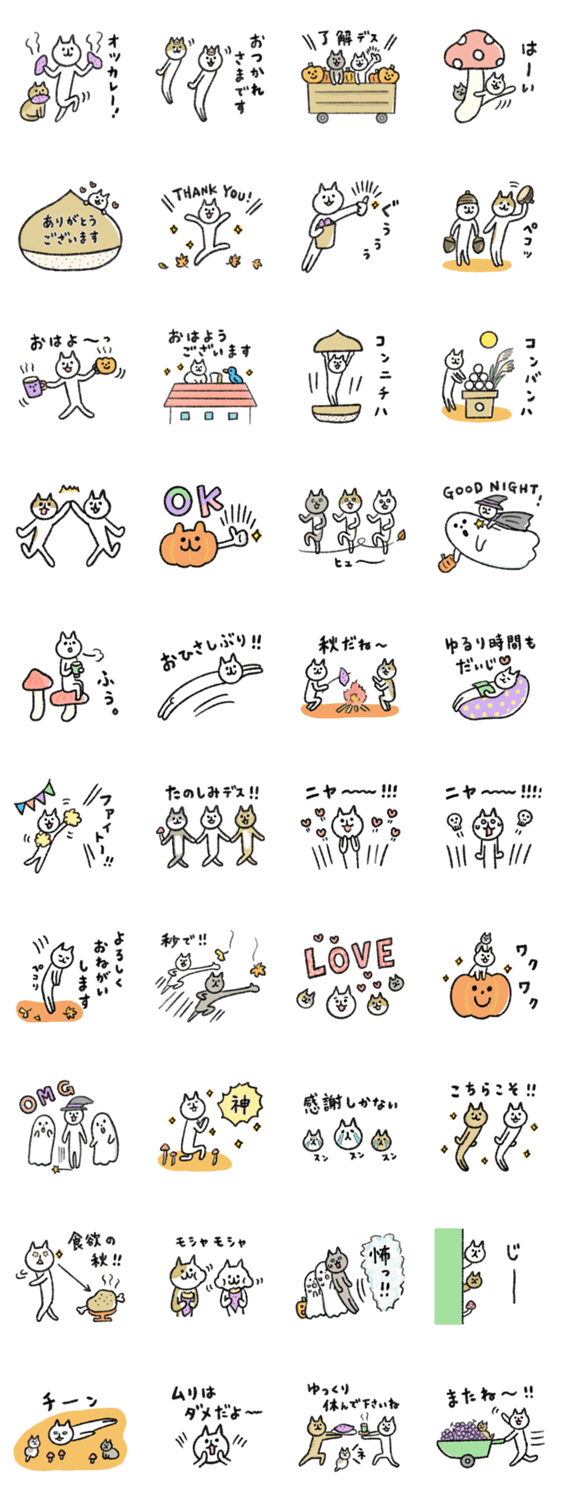 シュッとスリムな猫たちの秋スタンプ。よく使う言葉もたくさん入っています♪