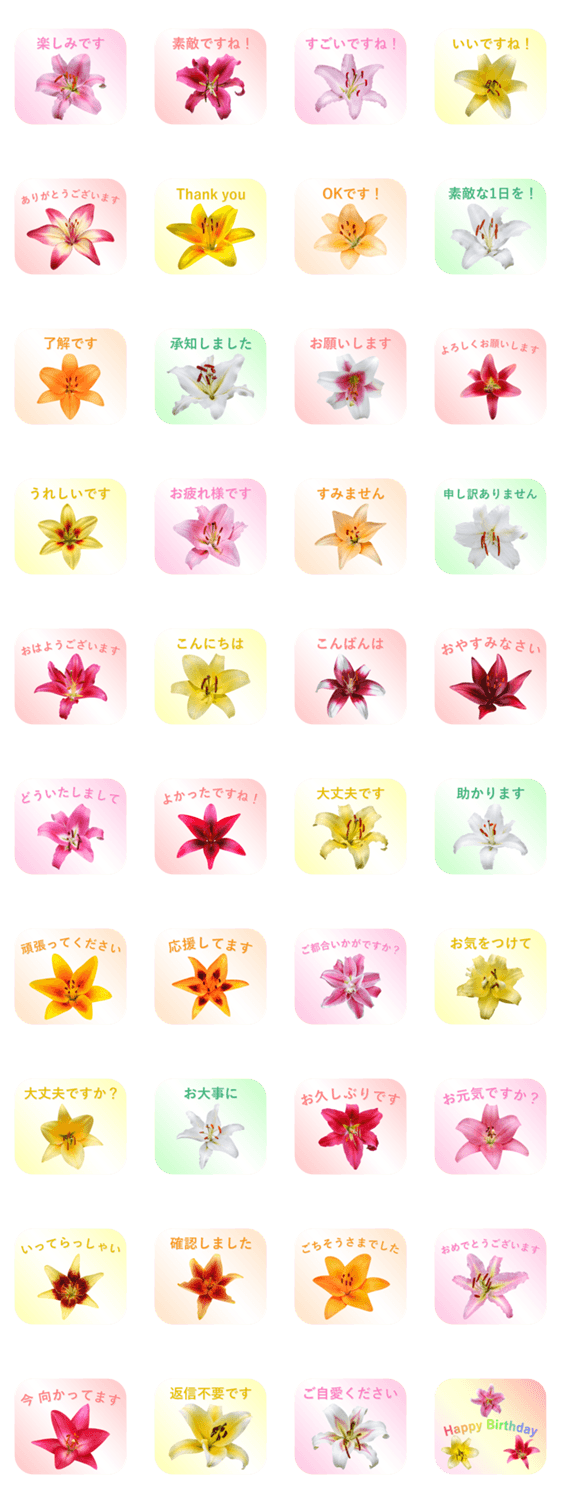 ユリの花の写真を切り抜きした敬語と丁寧語のスタンプです。ユリの花はオリエンタルユリとスカシユリです。ゆり, ユリ, 百合, lily