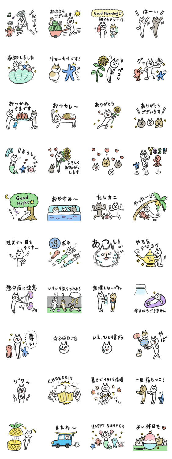 シュッとスリムな猫たちの毎日使える夏スタンプです♪