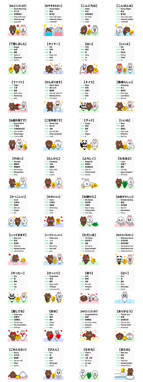 | スタンプ説明 | ブラウン、コニー、サリー、ムーン、パンヨ、チョコ、レナードが登場。世界言語の日本語、英語、中国語、韓国語、ベトナム語、インドネシア語、タイ語のスタンプです。 ※BROWN & FRIENDS をみんなでつくろう!キャンペーン参加スタンプです |
