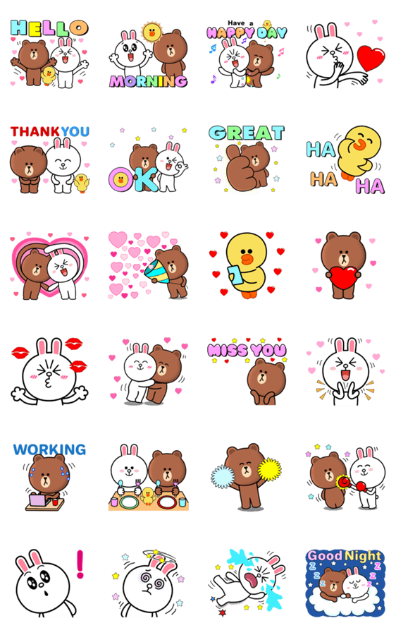 | スタンプ説明 | Brown, Cony, Sally animated Big Pop Ups for daily greetings. Send happiness, love, care, blessings on working days & other days. Make everyday Valentine's Day! Part of the "Make stickers with BROWN & FRIENDS" collection. |