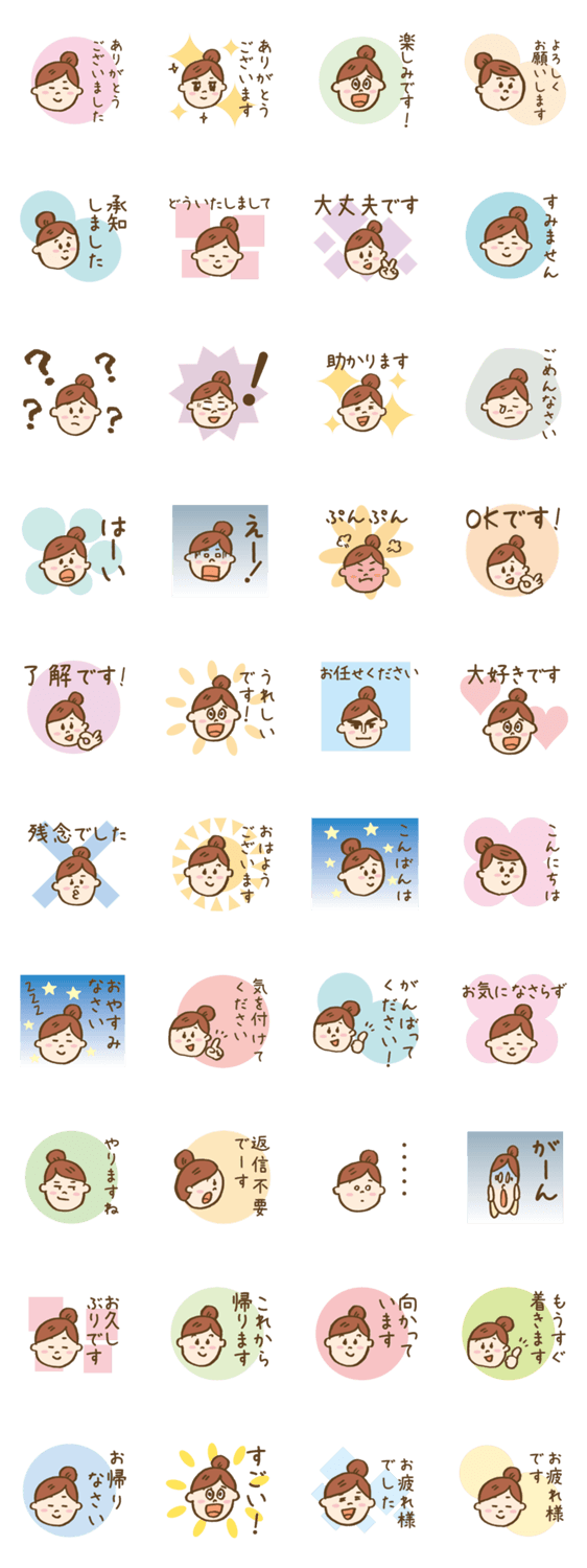 お団子の髪型をした女子の表情豊かな敬語のスタンプ。ママ友同士やお仕事上での目上の方とのやり取りや日常会話に便利。