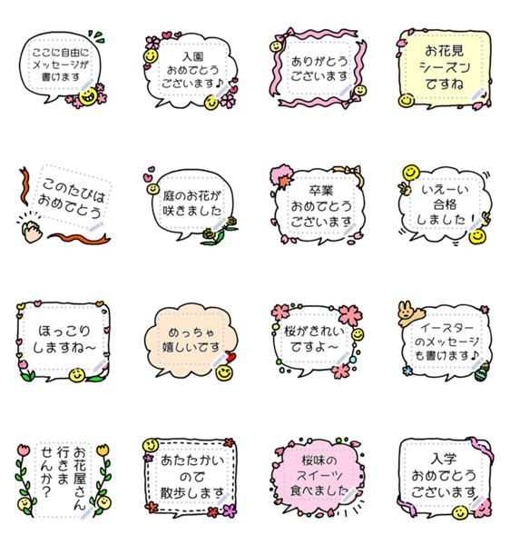 春を感じる線画の桜やニコちゃん、入学式・入園式・卒業式など季節の挨拶やメッセージを送るのにぴったりな自由に文章を書ける大人可愛いフレーム♡イースター吹き出しも♪ 現在この商品は一部のスマートフォン版LINE 10.3.0以上のトークルームでのみ使用できます。動作環境の最新情報はヘルプをご確認ください。