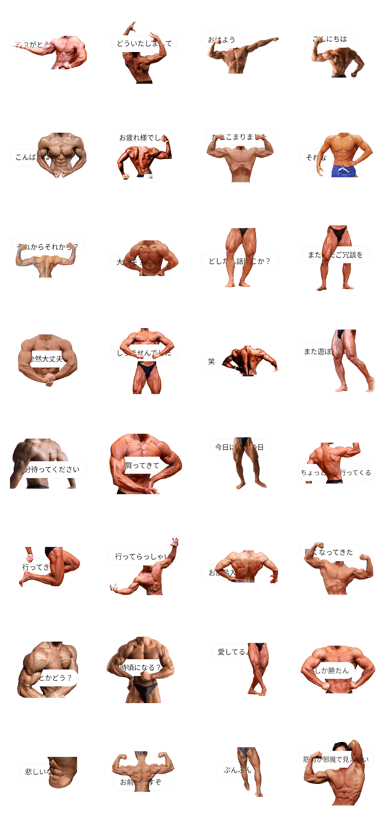 筋肉が会話の邪魔をするスタンプの第二弾です。 第一弾よりスタンプ数が増えました。