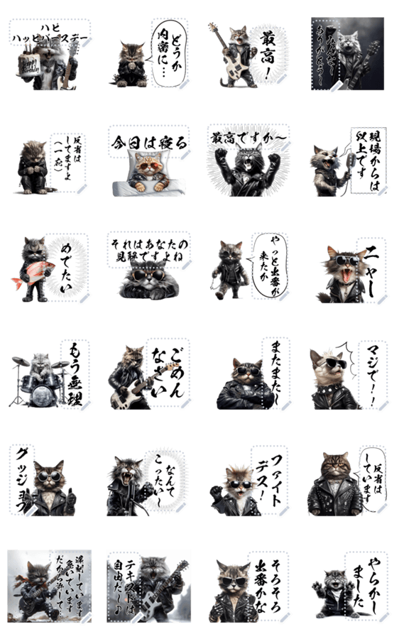| スタンプ説明 | 誕生日、おめでとう、ハッピーバースデー、happy birthday、cat、ロック、サングラス、ギター、ドラム、革ジャン、ベース、ケーキ、キャット、マイク、ユーモア、面白い 現在この商品は一部のスマートフォン版LINE 10.3.0以上のトークルームでのみ使用できます。動作環境の最新情報はヘルプをご確認ください。 |