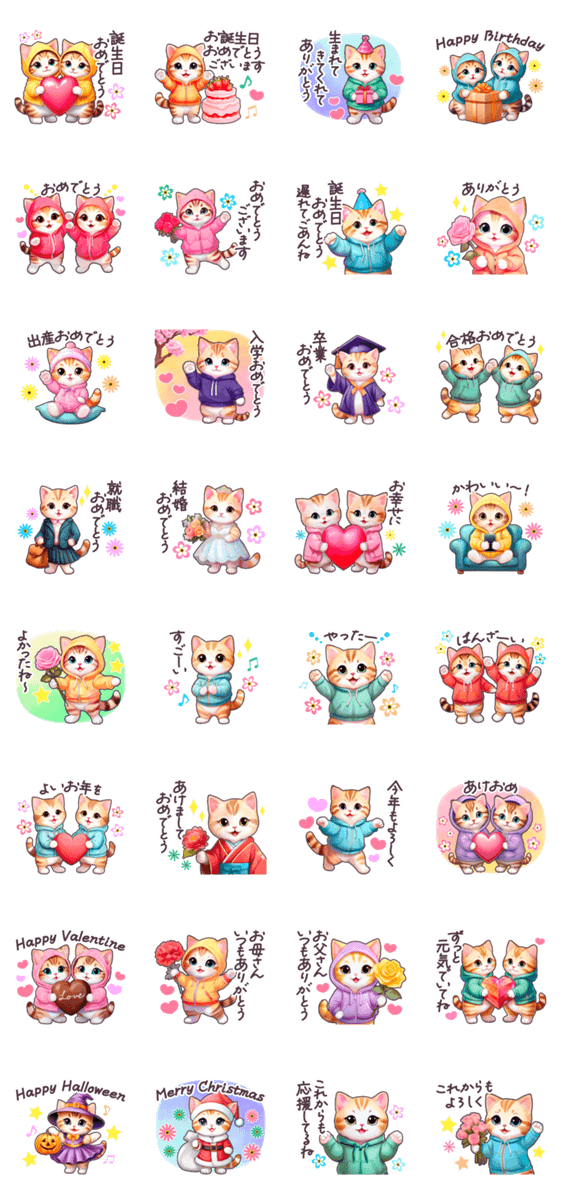 パーカーを着たネコのお祝いスタンプ。猫/ねこ/ネコ/子猫/子ねこ/お祝い/おめでとう/誕生日/正月/年賀状/バレンタイン/入学/卒業/母の日/ハロウィン/クリスマス/結婚/出産