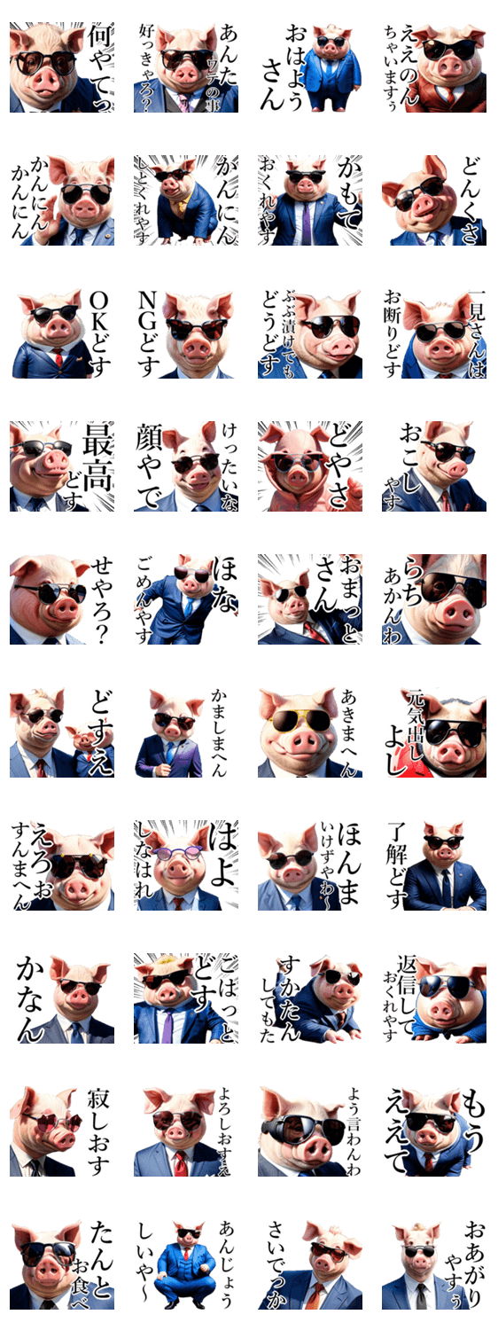 サングラスしたリアルな豚が京都弁で面白ろおかしく挨拶してくれるおふざけスタンプです☆方言/関西/京都/はんなり/煽り/ネタ/シュール/友達/家族/仕事仲間/連絡/AI/ピンク