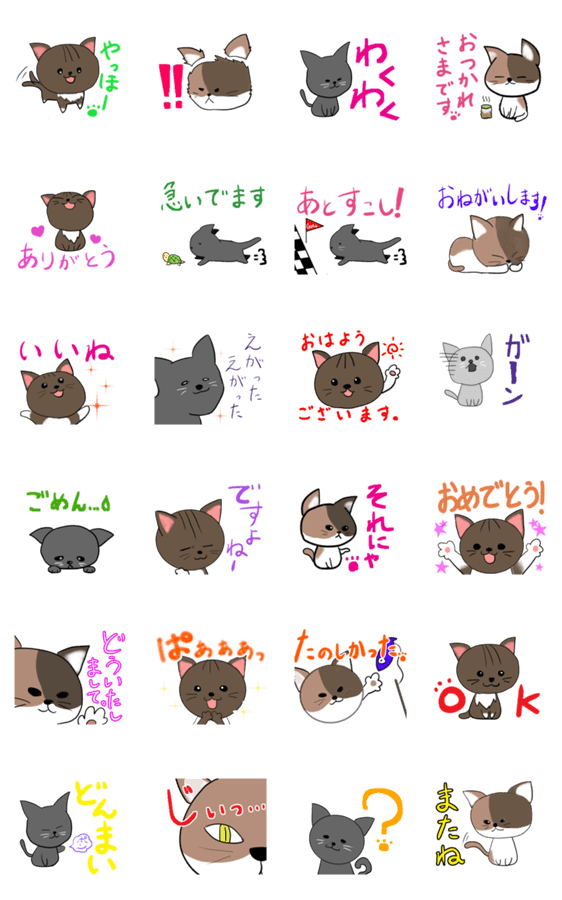 おばあちゃんと暮らす、おっとり黒猫、元気っこなキジトラ、お嬢な三毛猫のスタンプ。普段使いしやすい挨拶など、使用頻度高めの言葉で作ってます。猫好きにもおすすめ。