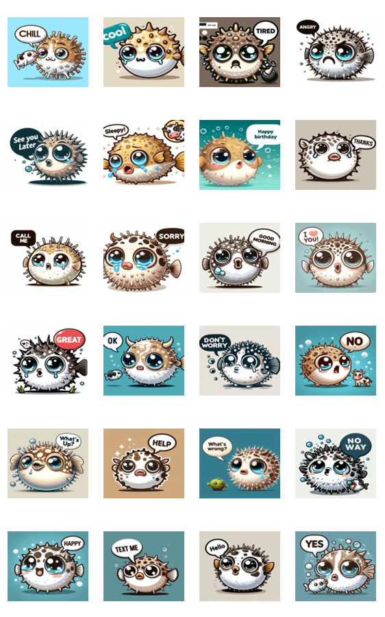 涙ぐむ可愛いハリセンボンのスタンプセットです。会話に癒しと楽しさを!