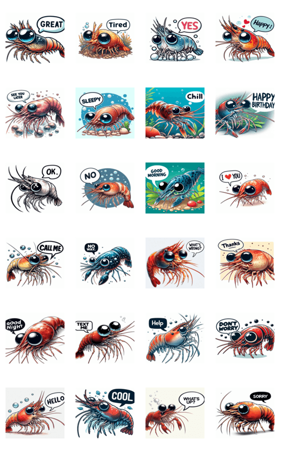涙ぐむかわいいミナミヌマエビのスタンプセットです。会話に癒しをプラス!