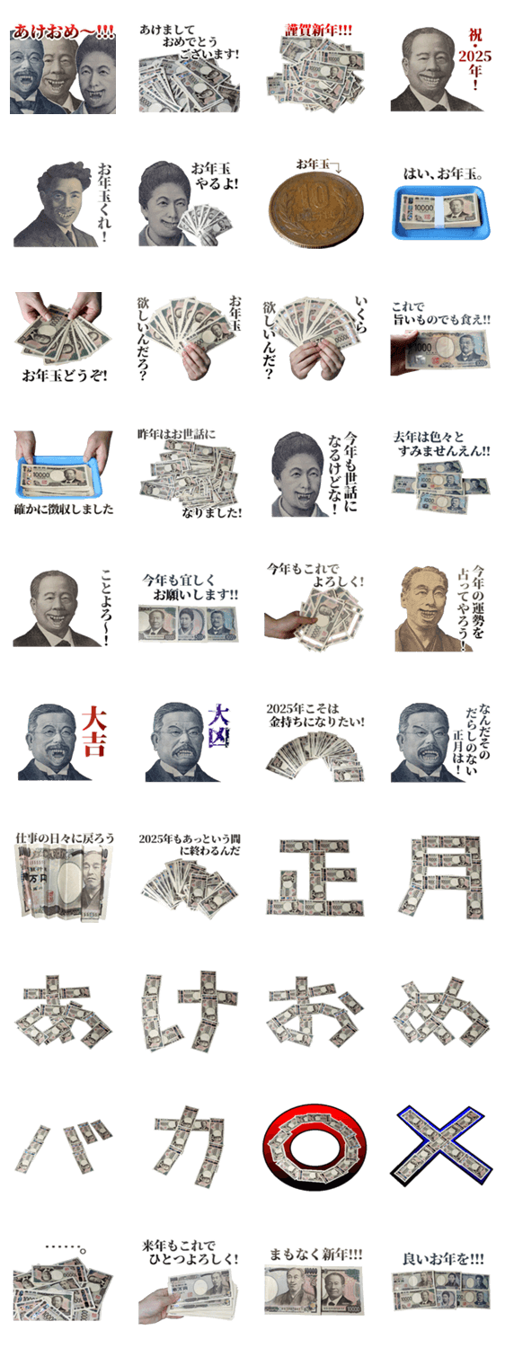 お正月や年末年始に使えるお金のスタンプです!2025年,謹賀新年,お年玉,年越し,大晦日,偉人,札束,マネー,おみくじ,新紙幣,実写,お金。あけましておめでとうございます!