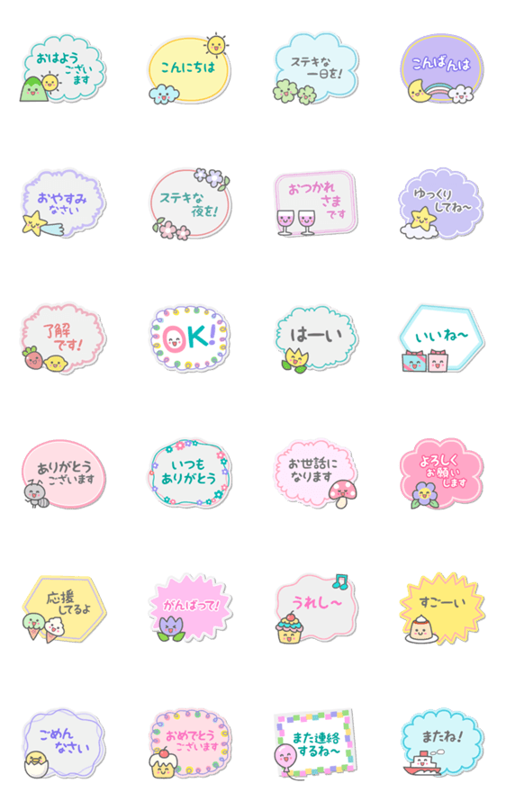 ペタッと可愛く使えるフレークシールのアニメーションスタンプです♩ よく使う日常言葉をセットにしました♬
