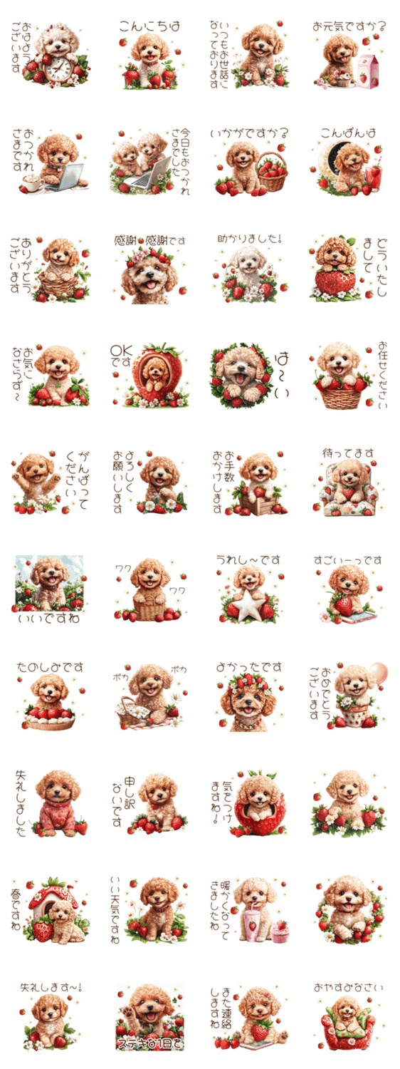春にぴったりの苺モチーフ♪子犬トイプードルのお仕事でもプライベートでも使いやすい敬語スタンプです♪