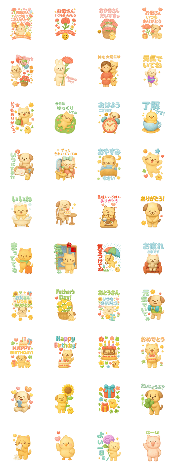 かわいい動物のぷっくりかわいくて優しい母の日と父の日のBIGスタンプ♪誕生日や普段も使える挨拶も盛りだくさん!使える40個 #ねこ #いぬ #ひよこ #うさぎ #母 #父 #ぶた ※このスタンプはトークルームで大きく表示されるBIGスタンプです。