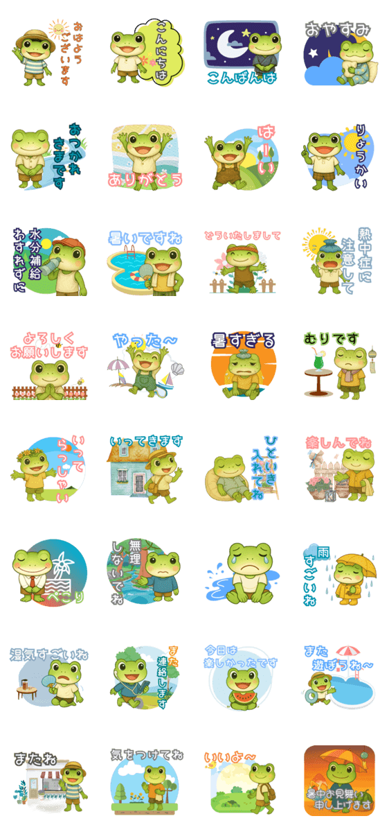 おちゃめなカエルが夏を元気にお届け!挨拶から季節の気づかいまで、使いやすい表情がいっぱいのスタンプです。