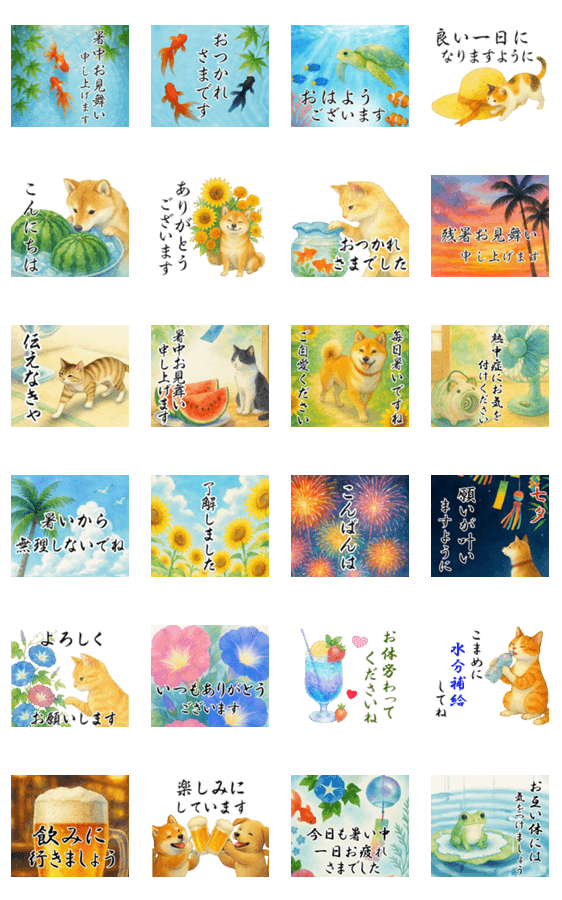暑い夏に健康を気遣う暑中お見舞いや残暑お見舞い、夏モチーフがいっぱいのずっと使える大人の挨拶シリーズ #ひまわり/海/スイカ/七夕/花火/ビール/金魚/朝顔/風鈴/扇風機