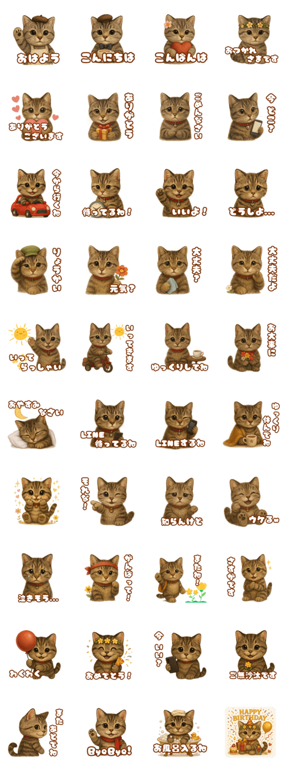 ふわふわキジトラのほんわかスタンプ第2弾。 ぬいぐるみみたいな表情で気持ちを伝えます♪