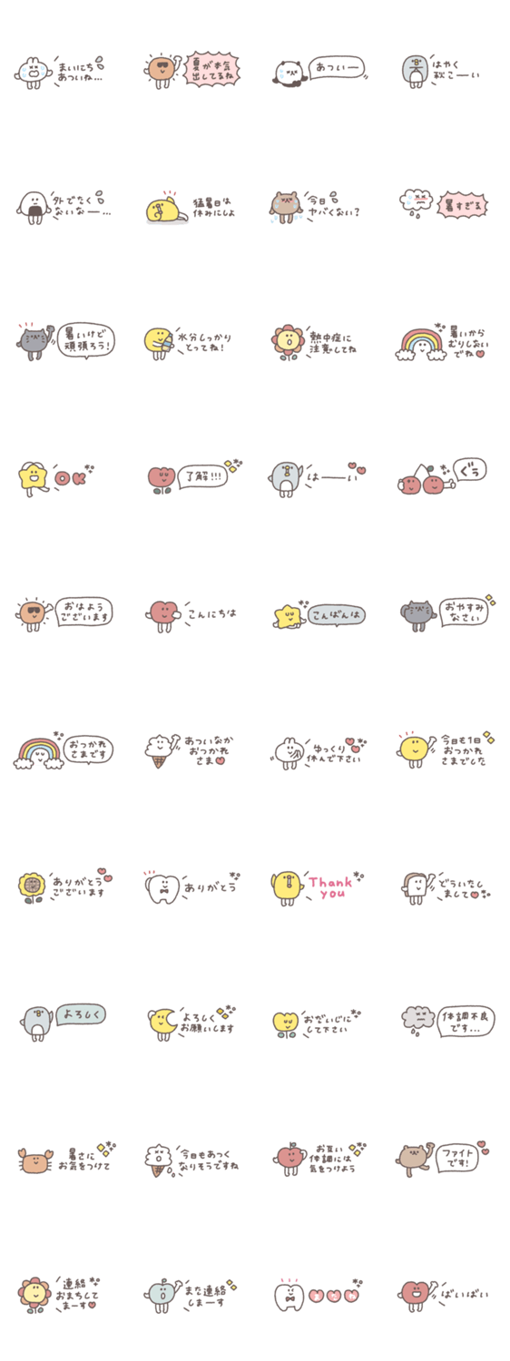 ゆるかわな生き物のあいさつスタンプです。 あいさつ/スマイル/手書き/くすみカラー/ペンギン/パンダ/トリ/うさぎ/くま/ねこ/歯/夏