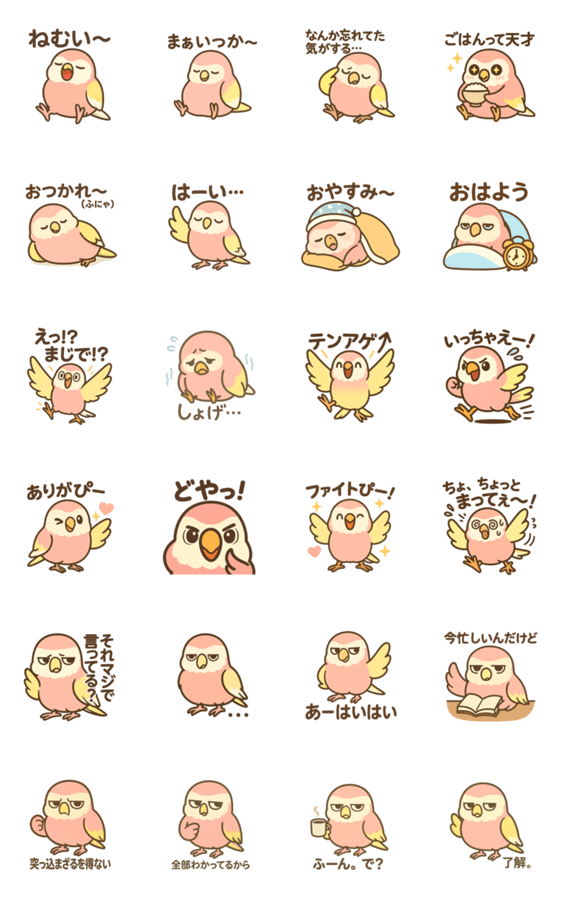 のんびりインコたちの、ちいさな毎日。ピヨピヨな気持ちを、やさしく届けるスタンプです。