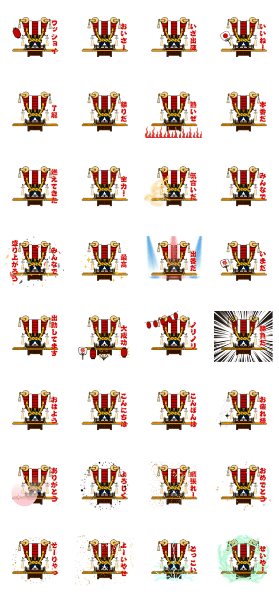 祭り好き必見!動くふとん太鼓スタンプ第4弾。白いふとん締めバージョンが登場!迫力ある動きと華やかな装飾で、祭り気分をトークに届けよう!