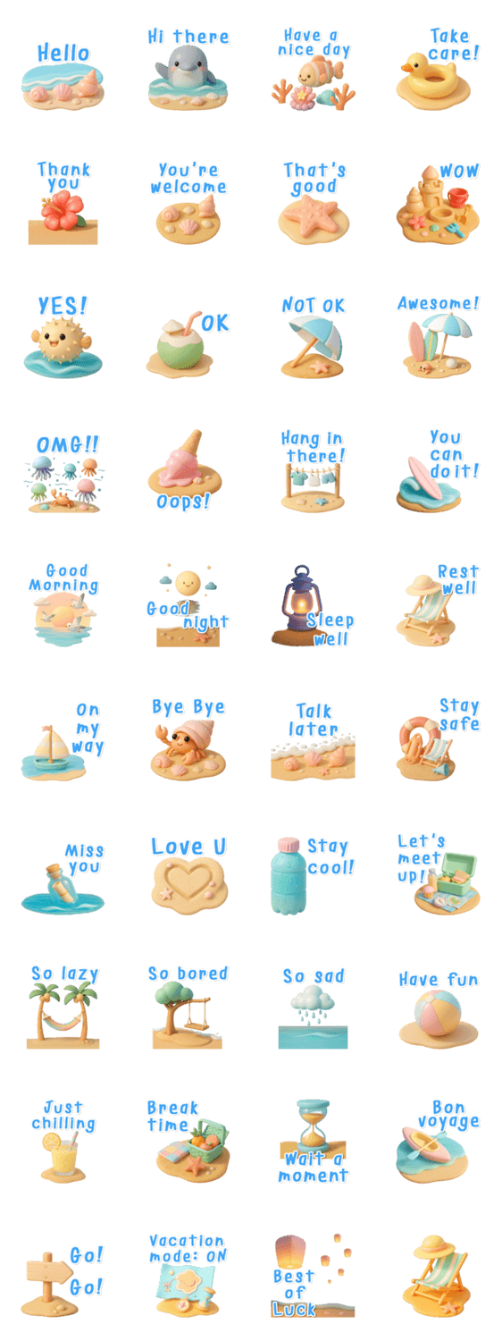 | スタンプ説明 | From seashells to beach umbrellas, this set captures the charm of a sunny beach day. Perfect for sharing good vibes, relaxing moods,and summer fun with friends. |