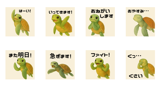 毎日のチャットにぴったりの、かわいいウミガメのスタンプです!友だちや家族とのあいさつ、ありがとう、 おやすみ、他にもいろいろ使えます。