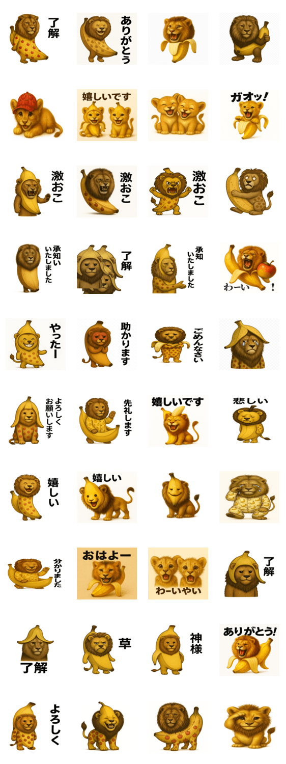 かわいくて元気いっぱいの「ライオンバナナ」スタンプシリーズ! 「ガオッ!」と叫ぶ姿がキュートで、日常の会話を楽しく盛り上げます。 友達や家族とのトークにぴったり