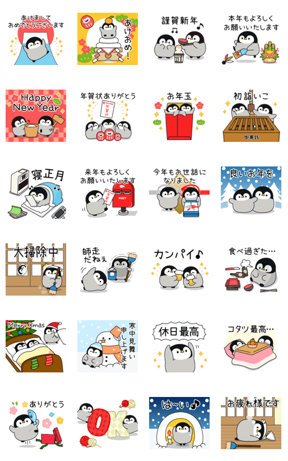 恋人や家族や友人とのお正月や年末年始の挨拶に使いやすい! ペンギンの赤ちゃんたちのかわいいポップアップスタンプです♪