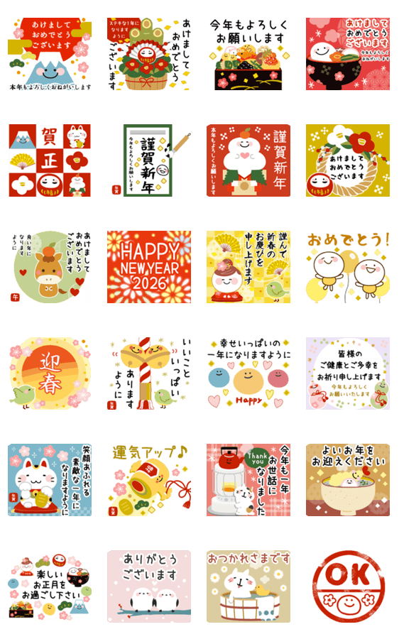 | スタンプ説明 | とびだす年末年始と正月★2026年/午/馬/新年挨拶/賀正/謹賀新年/無難/敬語/お正月/正月/干支/ポップアップ/年賀状/令和8年/あけおめ/挨拶/大人/午年/年賀/冬/山田まぽん作 |