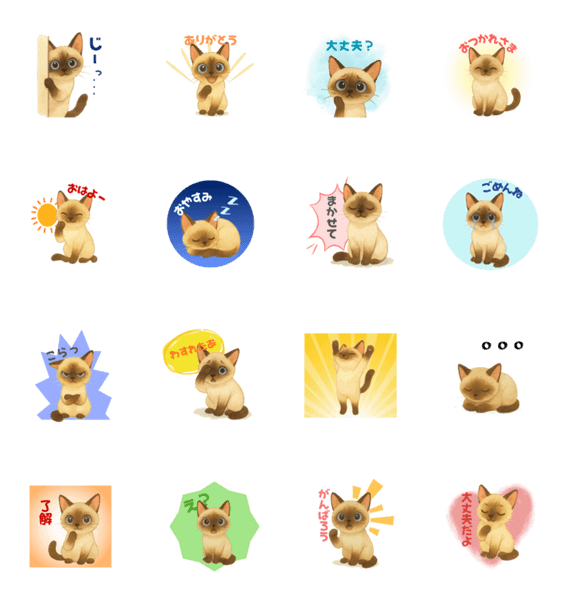 シャム猫のスタンプです。挨拶、リアクション、応援など幅広く使えます。シンプルで使いやすいので、誰に送っても喜ばれる万能スタンプです。