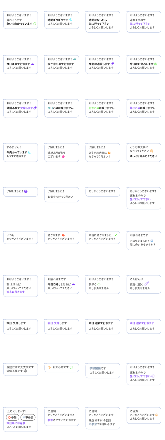 毎朝の集団登校や園バス・スクールバスのやり取りにぴったりの、 保護者向け連絡スタンプです。 幼稚園・保育園、子供会、PTAでの連絡にも使いやすい、 やわらかく控えめな言い回しを集めました。 「少し遅れます」「先に行ってください」「乗り遅れました」など、 朝の登校バス停でよく使うフレーズから、 「ありがとうございます」「助かります」などの保護者同士の気遣いを伝える言葉まで、 ママもパパも毎日安心して使えるよう丁寧な敬語で仕上げています。 バス停連絡/登校連絡/送り迎え/欠席連絡/お知らせなど、 忙しい時間帯にサッと送れる実用スタンプ。 毎日の通学サポートや子ども会の連絡にぜひご活用ください。 -
