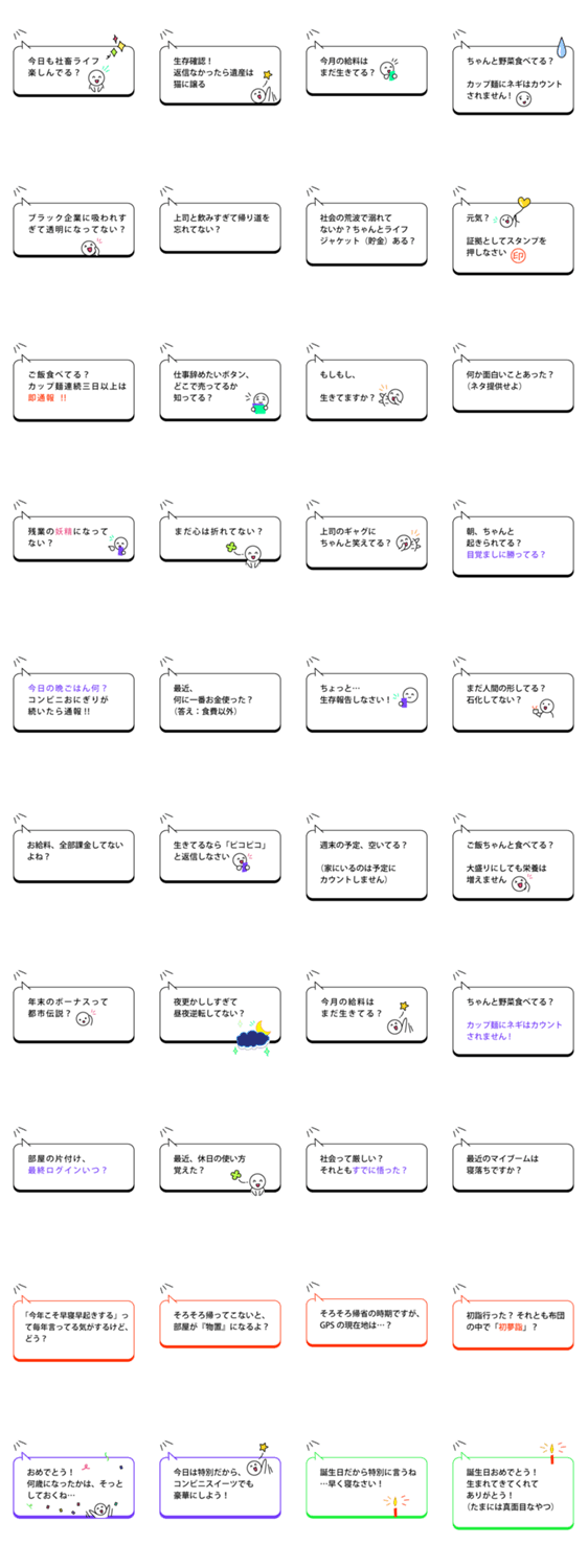 | スタンプ説明 | 社会人の子供が思わず返信したくなるギャグ、面白い安否確認メッセージ集!「元気?」と聞いても既読スルーそんな悩みを解決!社会人の息子 一人暮らし 就職の息子へ 娘へ |