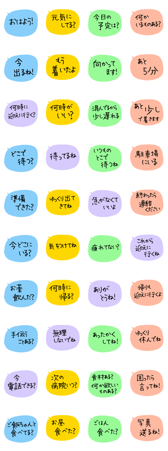 | スタンプ説明 | 実家娘 息子 宛 親 夫 妻 祖父母 義理 50歳,60歳,70歳,80歳高齢年配者も読みやすいデカでか文字#病院 #診察 #送迎 #MRI検査 #タクシー #待合室 #順番待ち #介護 #リハビリ |