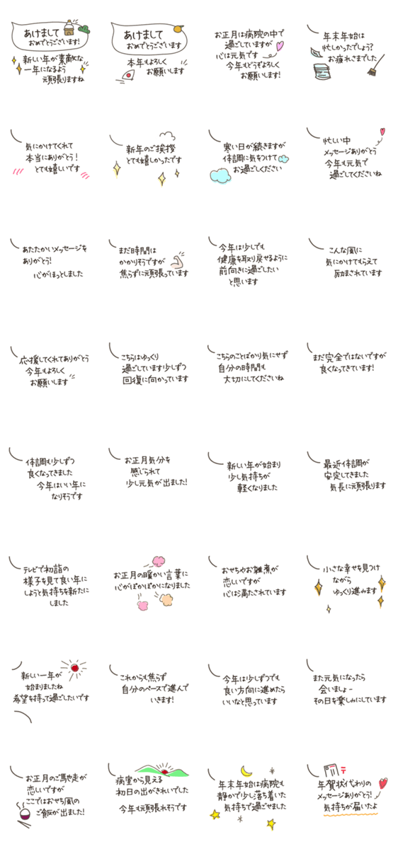 | スタンプ説明 | 療養中の親族,家族,友達のための新年挨拶,病状,感謝の気持ちなどの返信する際に使える言葉。病院から感謝の気持ちや前向きな思いを込めた言葉。励ます/入院生活/静養 |