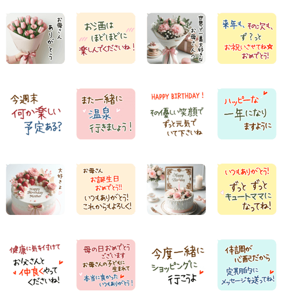 | スタンプ説明 | 普段に言えない本当の気持ちを届けよう,キュートママ,花束,カーネーション,チューリップ,お父さんと仲良く,体調が心配,実家 #お母さんありがとう #母の日 #母の誕生日 |