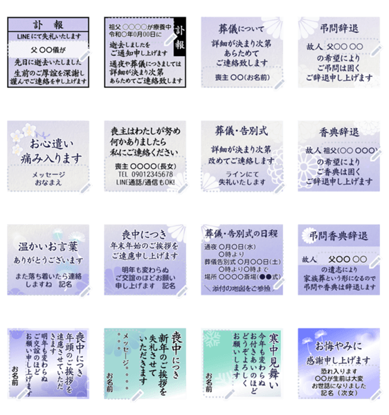 | スタンプ説明 | 訃報LINEにて失礼します/逝去/生前のご厚誼を深謝し謹んでご連絡を申し上げ/葬儀告別式/弔問香典辞退/故人/遺志/家族葬/喪中につき新年/失礼/お心遣い痛み/身内に不幸/和紙 現在この商品は一部のスマートフォン版LINE 10.3.0以上のトークルームでのみ使用できます。動作環境の最新情報はヘルプをご確認ください。 |