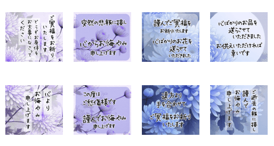 | スタンプ説明 | 葬儀,訃報,お盆,法事連絡にお悔やみの言葉や気持ちを届ける シンプル大文字。同僚/友達/親戚/町内/知り合い/葬式/葬儀/通夜/遠方/冥福/合掌/故人/花送/生前/菊の花/本紫 |