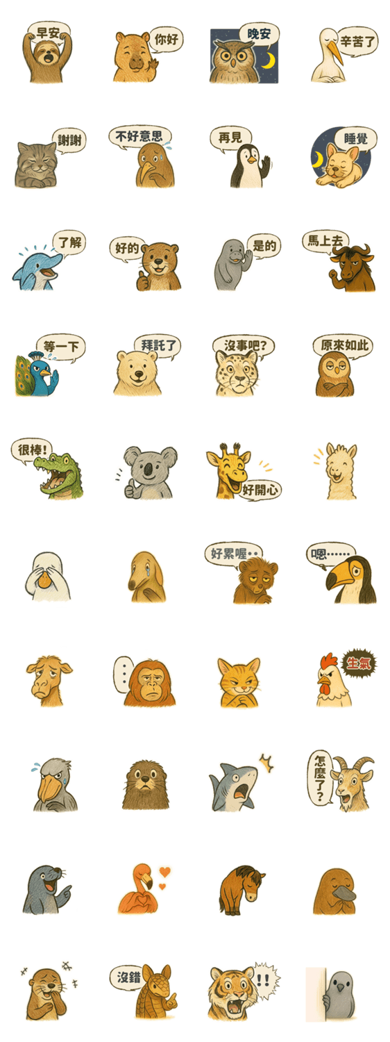 繁体字中国語セリフ入りの手描き風のどうぶつスタンプ。ゆるっと気持ちを届けてます。 日常で使いやすい表情・フレーズセット。手描き風/ゆるい/どうぶつ/かわいすぎない
