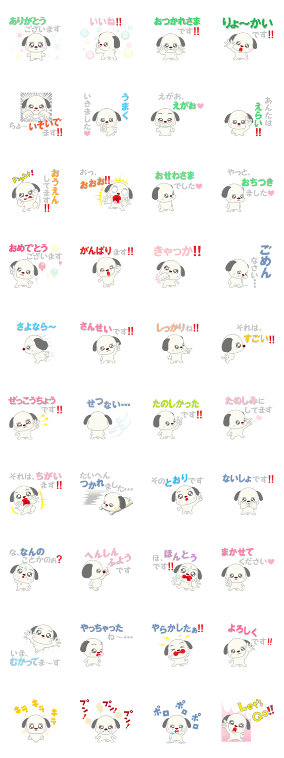 かわいい目をした犬のスタンプを、使ってみてください。普段使いのものの後に、ゴシック体の文字の部分を、五十音順で並べてみました。