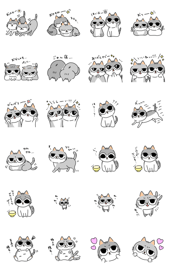 猫のうめたとゆずみのスタンプです!まんまるおめめで毛色が濃い方がうめた、平らなおめめで毛色が薄い方がゆずみです!