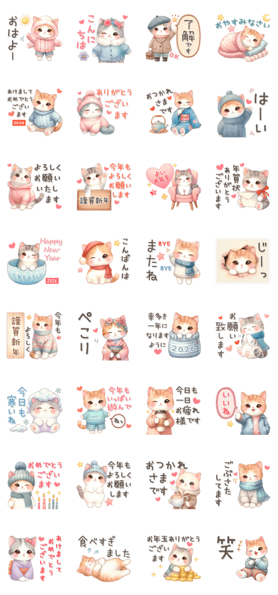 猫好きな方必見!毎日使える可愛い猫のスタンプです☆年末年始によく使う基本の言葉を集めました。お正月の挨拶や年賀状代わりに。(※2026年用に一部変更した改訂版です)