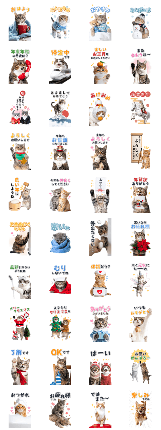 猫好きさん必見!年末年始・クリスマス・年賀のあいさつに使える、リアルで可愛いにゃんこのスタンプ♡※このスタンプはトークルームで大きく表示されるBIGスタンプです ※このスタンプはトークルームで大きく表示されるBIGスタンプです。