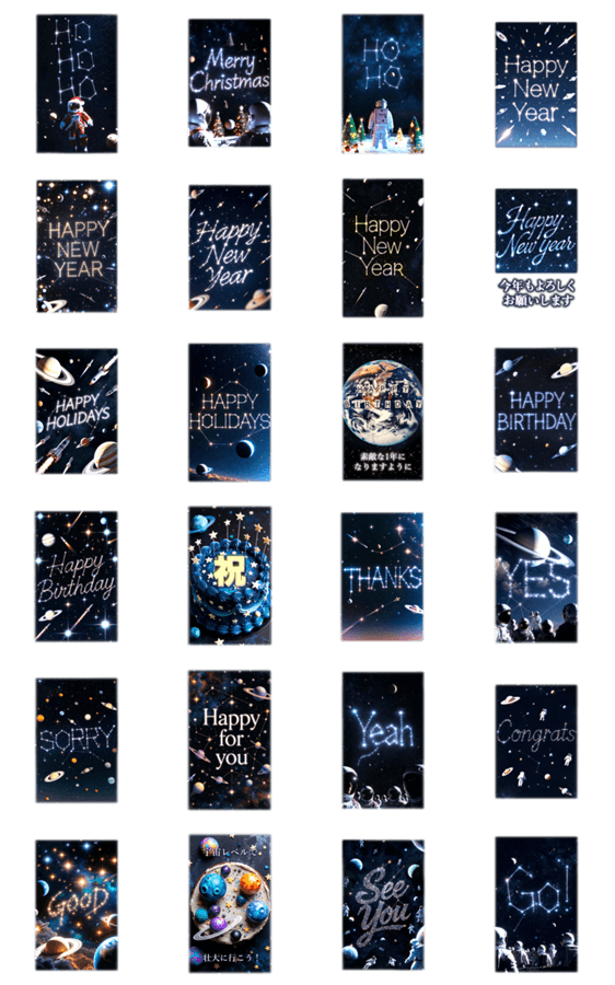 星座の文字で年末年始/新年の挨拶やお誕生日のお祝い★宇宙柄のケーキやクリスマスの宇宙飛行士も!キラキラ星空・天体・科学博物館・SFなどが好きな方にもおすすめ! ※このスタンプはトークルームで大きく表示されるBIGスタンプです。