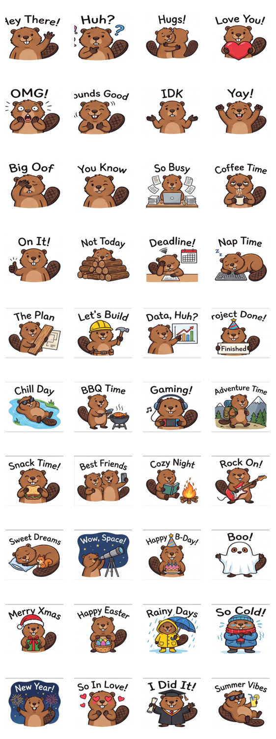 手描きのビーバーで気持ちを表現しよう!仕事のチャットや日々の気分、週末の楽しみに最適です。現代生活にぴったりの共感スタンプ。
