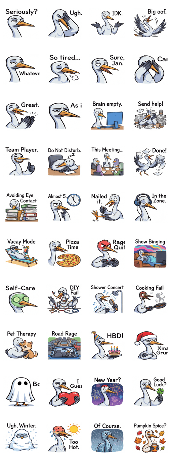 カラフルな手描きのツルが皮肉たっぷりに現代社会を生き抜く!仕事や週末、日常会話に最適です。