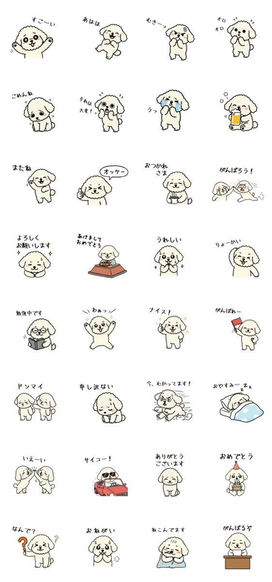 ふわふわな白い犬が喜怒哀楽を表現!「すごい!」から「ドンマイ」まで、可愛いトイプーがあなたの毎日に寄り添います。