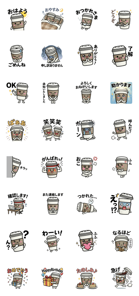 ゆるかわコーヒーカップの毎日使える日常スタンプ♪おはよう・おつかれさま・ありがとう・OKなど日常や仕事で使いやすい挨拶フレーズ。(日常・あいさつ・誕生日/癒し)