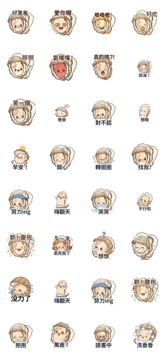 | スタンプ説明 | Oyster's soft, lazy life in a hard shell! Round body packed with apathy, tsundere vibes, and cuddles. Adorable expressions perfectly capture your " |