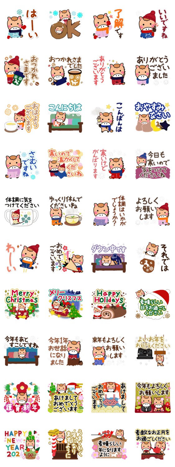 大人かわいい冬の毎日と年末年始にとても使える馬の敬語スタンプです!(うま・午年・お正月・年賀状・年越し・あけおめ・大晦日・クリスマス・よいお年を・さむい・雪)