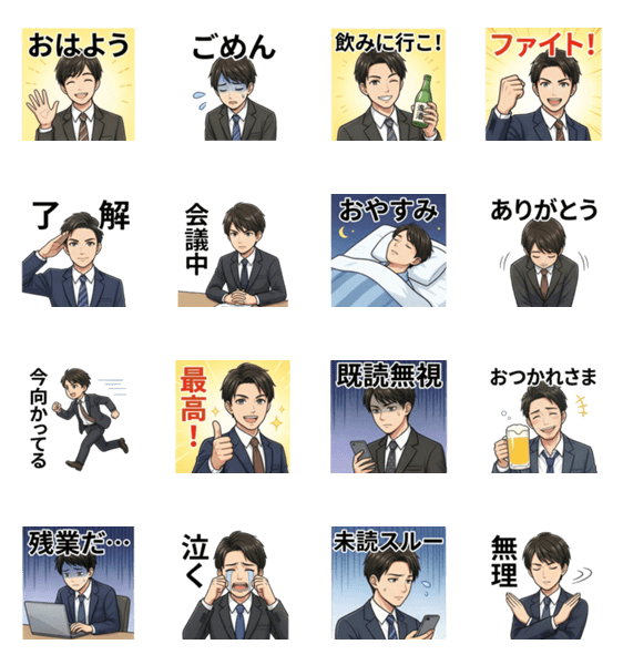 ビジネスからプライベートまで使える、若手サラリーマンのスタンプです。基本の挨拶はもちろんコミカルな感情表現も充実。上司や同僚友達とのやり取りで大活躍間違いなし!